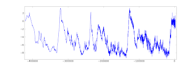 wenn man sich die letze Grafik (letzten 400.000 Jahre) mal genauer anschaut und wenn mich meine Augen nicht täuschen, erkennt man doch eine Regelmäßigkeit in den Temperaturausschlägen.