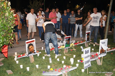 Wie es der Zufall will fand an dem Tag wo ich den Gezi-Park besuchte, die Errichtung des "Schreins" der sechs Toten statt. Das war übrigens die einzige Aktion die stattfand, denn wie mir von den Aktivisten berichtet wurde, wird jede politische Aktion sofort von der Polizei beendet. Sobald eine Versammlung stattfindet und Plakate erscheinen wird diese Meinungsäusserung von der Polizei unterbunden.
