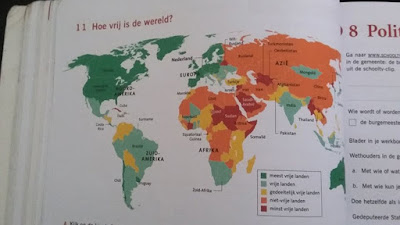 Zudem wurden in unserem Buch auch solche Karten mit "freien und unfreien" Ländern gezeigt, die genauso aussahen und Texte fingen häufig an mit "Was können EU und NATO in internationalen Konflikten tun?" (übersetzt: Der Westen ist der Gute).