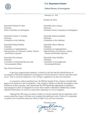 Donald Trump hat wiederholt seit Anfang des Jahr gesagt, Hillary ist kriminell, weil sie unter vielen anderen strafbaren Handlungen auch die Sicherheit der Vereinigten Staaten mit dem Betreiben eines privaten E-Mail-Servers kompromittiert hat. Er hat auch FBI-Chef Comey scharf kritisiert, weil dieser das Verfahren gegen Hillary im Juli eingestellt hatte.