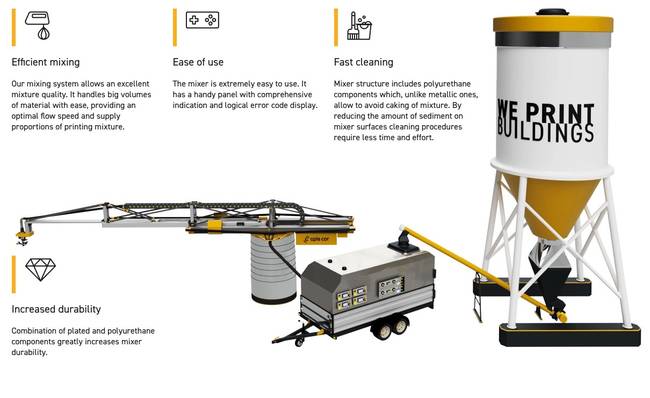 Das System besteht aus dem kompletten Set, wie Betonsilo, Mischer, Pumpwerk, Steuerungseinheit und Printer. Kann alles mit einem Lastwagen an die Baustelle geliefert werden und die Inbetriebnahme erfolgt in einer Stunde.
