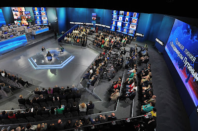 In einer kämpferischen aber auch ironischen Stimmung hat er den Spiess umgedreht und gesagt, es waren die USA die Einfluss über die russischen Wahlen ausübte, indem sie NGOs finanzierten, als Teil nach dem Streben für Weltdominanz. "Man drehe den Globus und zeige mit dem Finger irgendwohin, dann wird man amerikanische Interessen und Beeinflussung dort finden."